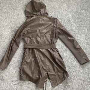 Grey bcbgeneration spring jacket with a hood. Used. Gold zipper and button detail - no rips or tears - with hood but you can hide the hood in the collar. Has a belt