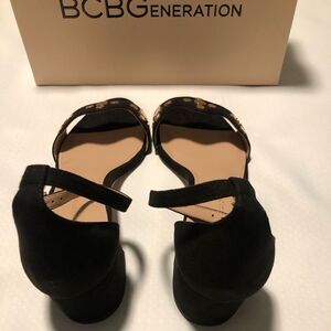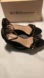 This is new in box. The color is black with gold details. Stretch adjust buckle. The heel is 1.5 inches. Fabric uppers. The balance is man made. Medium width.