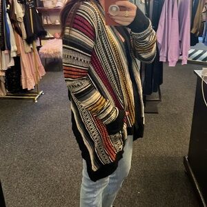 Colorful printed open front cardigan, side pockets, pre-loved condition