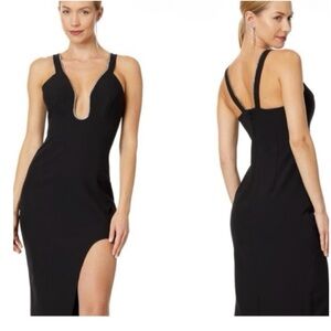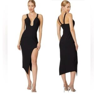 BCBGMAXAZRIA Black Sleeveless Midi Cocktail Dress With Front Slit Cut Out Rhinestone Embellished Halter Midi Asymmetrical LBD