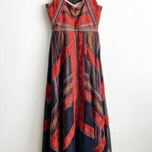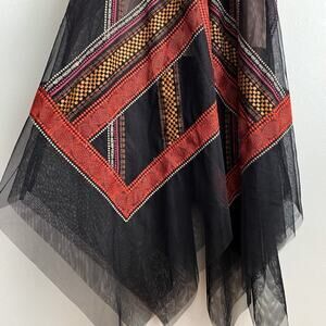 Featuring a striking embroidered design, a high-low handkerchief hem, and layered tulle, lace, and embroidery detailing. Halter neckline overlaid with mesh. Sleeveless silhouette. Fitted at the waist for a flattering, nipped-in look. Fully lined. Slip-on style. Material: 100% nylon. Fits true to size, order your normal size