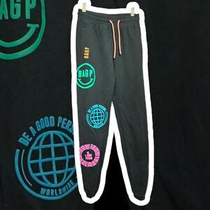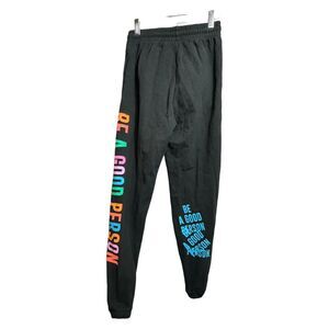 “Be A Good Person” Multi-Colored Sweatpants in Size XS. These vibrant sweatpants feature a cheerful design that encourages kindness and good vibes. Crafted from soft, comfortable fabric, they’re perfect for lounging or casual outings.