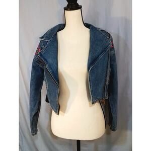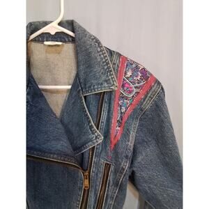 Be Bop; Jean jacket, zipper pockets, front and cuffs. Wide elastic at sides of waist. Colorful pink and purple design inside triangles.
