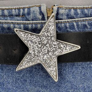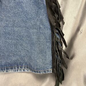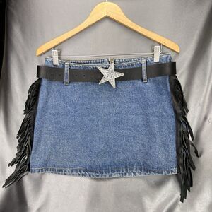 Be Bop USA Y2K Denim Mini Skirt Womens Size Medium Black Fringe Glitter Star Belt Cowgirl Western Boho Summer Festival Concert Fashion