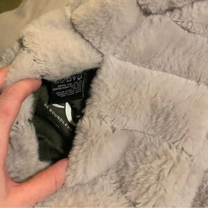 Be Boundless faux fur lined puffer coat with hood Style is reversible: olive green cotton/polyester smooth fabric and cream faux fur (very soft!)