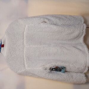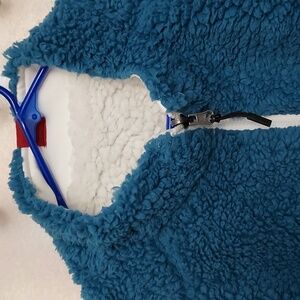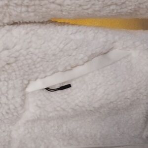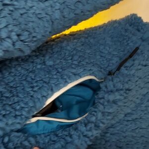 Unisex Be Boundless reversible jacket, off white/aqua, faux fur, teddy bear, full zip, side zip closure pockets, stang up collar, adjustable bungee cord at hem, comes in manufacturing package, new with tags, very good condition