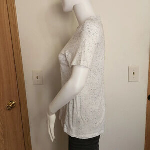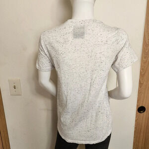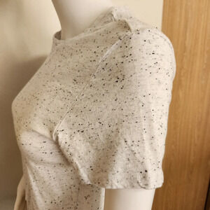 Solid white with black speckles. Drawstring up the side with metal ends so you can cinch it up. Straight, tight fit. 98% cotton, 2% polyester, crew neck.