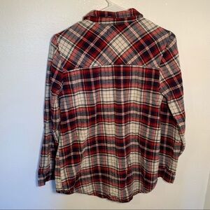 Good condition, minor pilling. Be Cool. Button Down Flannel Shirt. Chest pockets. Navy blue with white and red plaid pattern. Buttons at inside of neckline to add hood. Roll tab sleeves. Style 14086. Size small. 100% cotton. Pit to pit laying flat 19” Shoulder to hem 25”/27” Sleeve (pit to hem) 18”. All measurements are approximate and taken lying flat. Smoke free home. No trades, offers welcome.