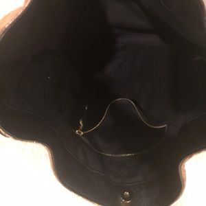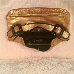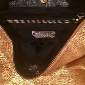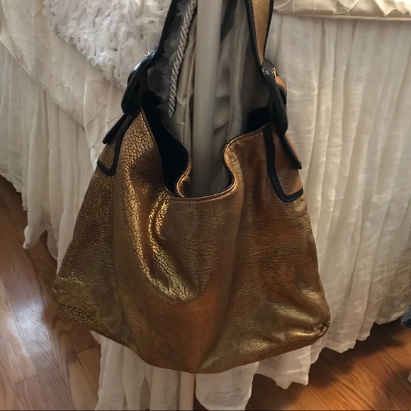 Glittery gold textured leather with black leather accents. Fabulous large Hobo bag!!!Beautifully handcrafted, high quality, and very hard to find. Leather is nice and thick (better than glove quality), lined with think black denim like fabric, inside zipper pocket and opposite side has cellphone holder. No visible signs of wear except for little scuff on bottom front (see last picture) does come with dust bag but not with Be & D logo.