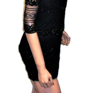 You are viewing a Black sheer mesh lined sparkle dress by be envied Sz M, Polyester/spandex blend, the measurements were made with the garment laying flat unstretched bust 26", 22" and from the top of the shoulder to bottom of hem 32". The dress is in good condition without rips or stains.