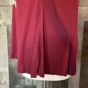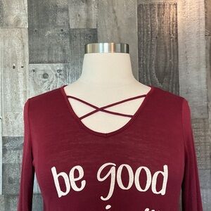 This Christmas-themed long sleeve shirt is a deep berry red with cream text. It is a great mom shirt for the holiday season. The shirt has a flowy look and cross cross at the front. It is gently worn and is in excellent condition!