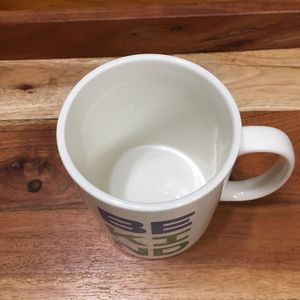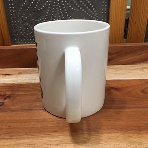 This stoneware mug features a white exterior & Blue, Green Lettering