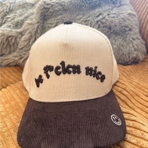 Stylish SnapBack cap with 'be f*ckn nice' embroidery. Two tone corduroy. Worn for like an hour once.
