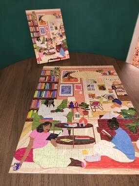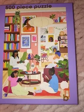 Be Rooted -EUC colorful illustrated 500-piece puzzle featuring a cozy reading room scene. Vibrant purple border with multicolored interior artwork.