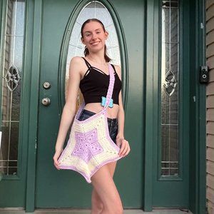 Whether you are at the beach, or hanging out with friends, this bag will hold all of your essentials! The light purple accents the cream in this unique design.