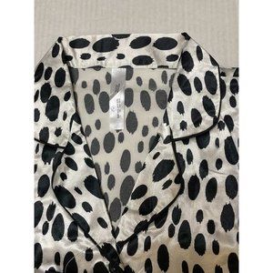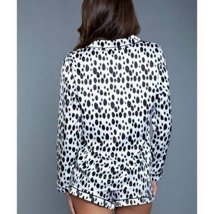 Satin silky-smooth set features a dalmatian print, revere collar, button placket, chest pocket.