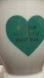 This two sided inspirational mug is white with the quote “Be Your Own Kind of Beautiful” in gold text inside a turquoise heart (on both sides). The gold text is quite reflective as seen in the video. This ceramic mug by Fringe Studio can hold up to 16 ounces (12 oz comfortably) and is in very good used condition.