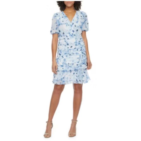 NWT Be by Chetta B Floral Print Puff Sleeve Ruched Sheath Dress Blue Women's 16