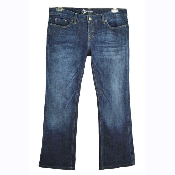 BeBe Dark Denim Jeans Size 31 Back Pocket Silver Sequin Detail Logo Boot Cut