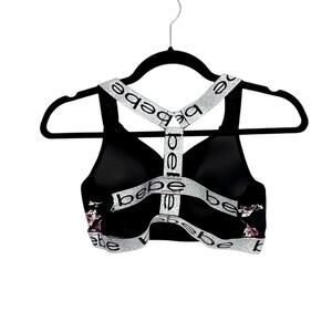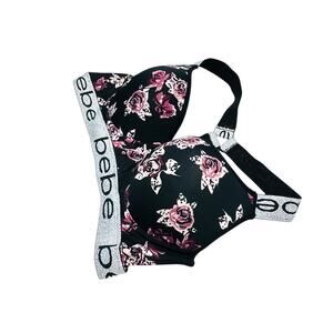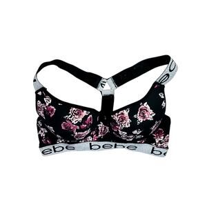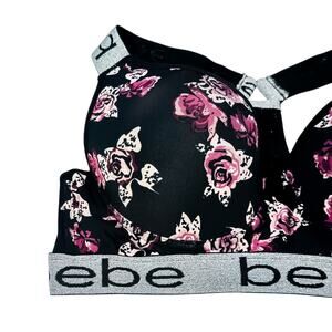 Elevate your activewear collection with this striking BeBe Floral Bra in a bold black base adorned with a rose print and shimmering silver logo band. Crafted from a comfortable polyester-spandex blend, this size XL bra features a stylish cross front strap design and moderate support - perfect for both fashion and function. A standout piece for any fitness or casual look.