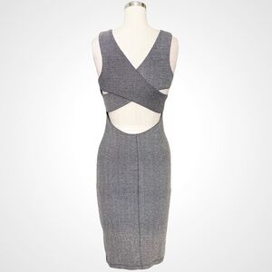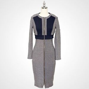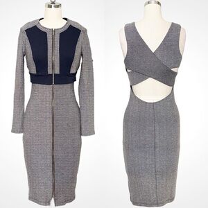Bebe Metallic Zipper MIDI Bodycon Sheath Dress with a Cropped Jacket. Zipper has dual zippers that zip up and down for a sexy look! Open back with a cross design so you can still wear a bra. This is a thicker knit with a lining to smooth for those perfect lines! Super stretchy. Should fit most smalls and mediums. Sparkly metallic thread over black. Gold zipper. Like new. Size small.