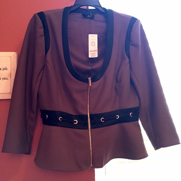 O M G... This jacket is SEXY on. So it's got a fitted waist and deep neckline. I would model it but my back and shoulders are a little big for it. It has leather and gold detail. When I tried it on I had skinny jeans and black boots on and it was hot. I gained about 15 lbs this summer and now it's too small. I'm not dying to give it away because I'll fit back in to it soon but if you buy it before it fits me again it's all yours!