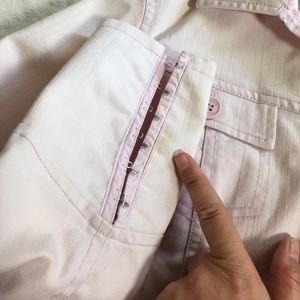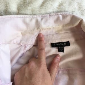 This Bebe jacket is pre loved. It is a light pink. It has some discoloration ( pink yellow) from hanging in closet as well. Also discoloration on wrist and neck (see images). I would only buy this is you are crafty and plan to re dye it as it is in desperate need of some dye love. However, this jacket is great for summer/ spring. Goes well with jeans. It's a great buy for Bebe. Size small