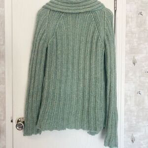 This Bebe open front sea foam colored open from draped cardigan is in excellent preloved condition with no noticeable signs of wear. It has a draped open front with a cable knit pattern . No belt Included.
