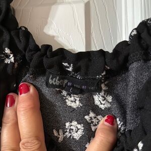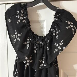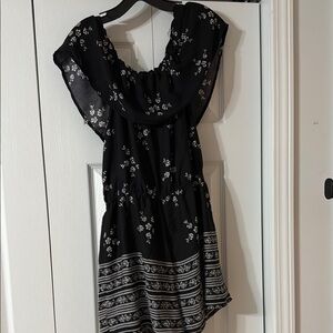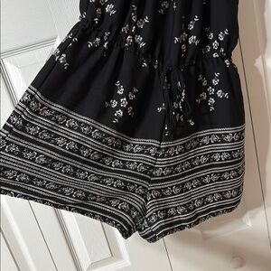 The BeBop Black and White Romper is a chic mini romper perfect for casual outings or resort wear. Featuring a scoop neck and flutter sleeves, this sleeveless romper showcases a stylish black base with a white floral print. Its lightweight fabric and gathered waist ensure comfort and a flattering fit, making it an ideal choice for warm weather.