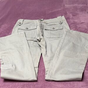 NWT Stylish boot cut jeans by BeBop. Features a light gray color. Perfect for casual wear. Had working zipper on left pocket , pockets on side and bottom of left leg. Fun! Has 95% cotton with 5% spandex. Never worn!