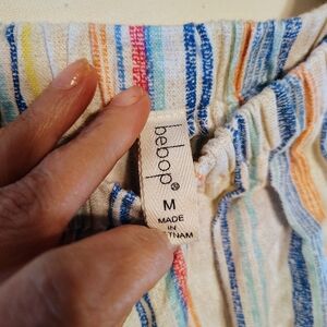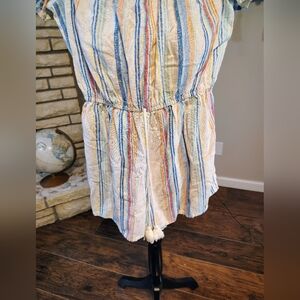 Vibrant romper with multicolor stripes. Off-shoulder design. Elastic waist for comfort.