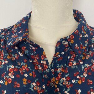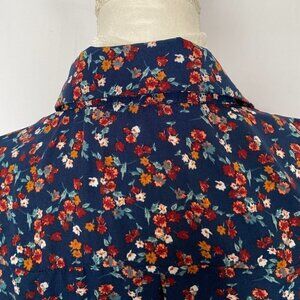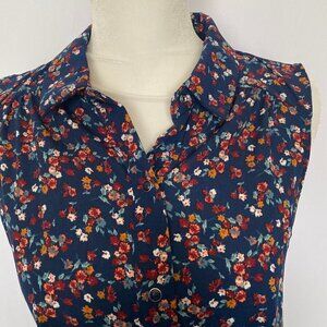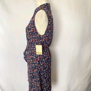 BeBop Navy Blue Floral Daytime Casual Mini Sleeveless Dress covered with mini flowers...orangey, greenish blue, white, mustard & pinkish colors...elasticized waist in the back...10 small nap navy blue encircled with silver buttons for front shirt style closure...has short tie at waistline ...summer, spring, daytime...fun...casual... dress...NWT...various sizes...020421
