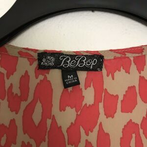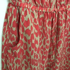 Women’s sleeveless dress by BeBop. This pink and tan dress has a leopard print pattern, detailed neck, an elastic waist, and pockets. It is 100% polyester.