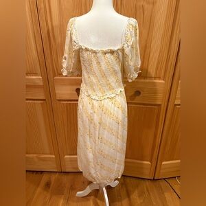 The square neckline is accented with ruffles and can be styled as an off-the-shoulder or on-the-shoulder look with elbow-length sleeves, featuring elasticated cuffs. The skirt flows from the fitted bodice, likely in a relaxed fit, and features a slit for ease of movement and added style. The dress is made from a stretchy fabric, ensuring comfort and a good drape. Women’s L good condition. See measurements to insure this will be the proper fit for you. Thanks for looking!