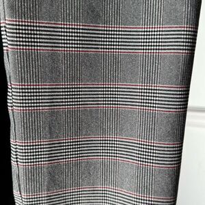 Size 9. In excellent condition. Colors are black, white and a fine red line. Zipper front with two hook and eye closers. Two side pockets and two faux back pockets. The pants are stretchy and cropped ankle length.