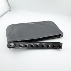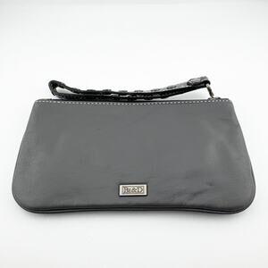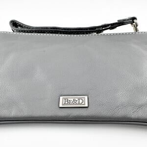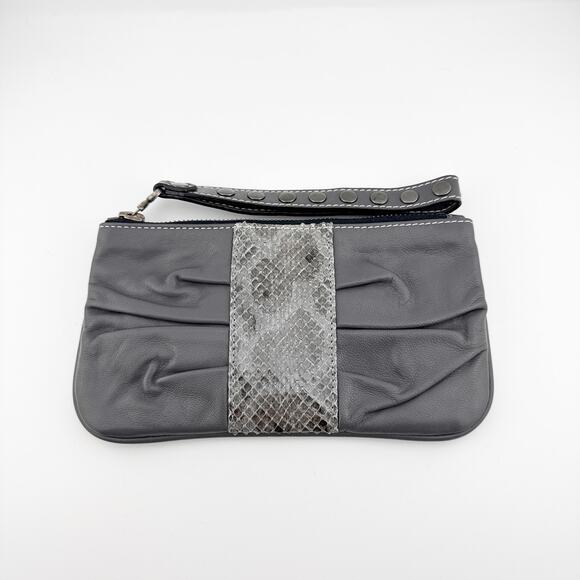 Be&D gray leather wristlet with studded strap and snakeskin center detail. Chic and compact clutch for everyday or evening use.