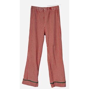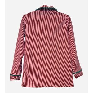 Fun and festive holiday boys pajamas, size 6 by BeMine Collection. Button front top with long sleeves. Pants pull on with elasticized waist. Red and white stripe with green piping. Cotton blend. Machine washable.