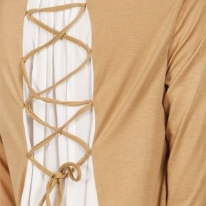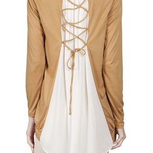 A'REVE Soft mustard top with chiffon in back laced up! Oversized hi-low comfy tunic top. Great with leggings.