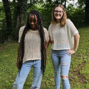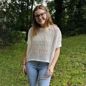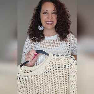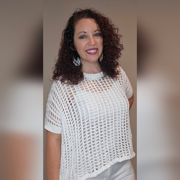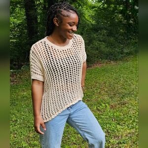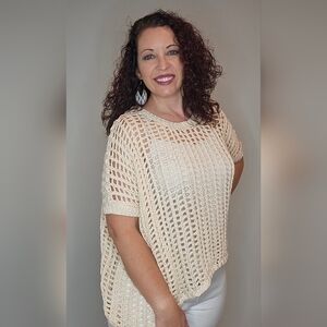 Beach Babe Top. This adorable short sleeve open-net crochet top gives me all the beach vibes. Toss this over a tank, your bathing suit, or bralette and you are ready to go. Lightweight and flowy, meant to be oversized. This top will look perfect paired with white shorts, capris or jeans. So many color options can be worn underneath it as well. Fits oversized. Available in S, M, L, XL in White, or Oatmeal.