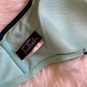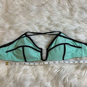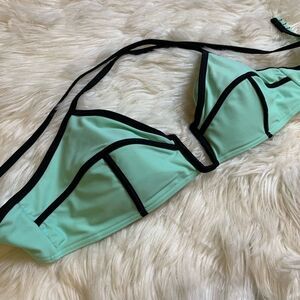 Features: mint bikini swim suit top with cups. Black trip and linear design! Cross-cross strap back. This is adorable worn with plain black bikini bottoms of your choice!