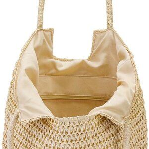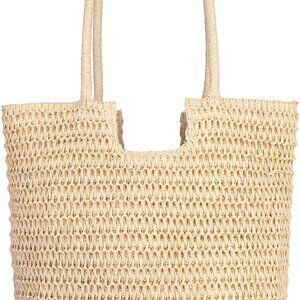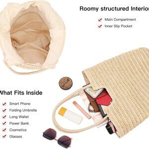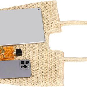 Features: Spacious woven straw tote measuring 22" x 14" that easily holds all your beach essentials or daily items. The premium straw exterior gives it a rustic charm, while the polyester lining and secure zipper add modern practicality. Lightweight and comfortable to carry, with sturdy construction for long-lasting use.