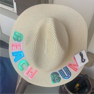 Stylish straw hat featuring 'BEACH BUM' in colorful sequin letters. Perfect for sunny days.