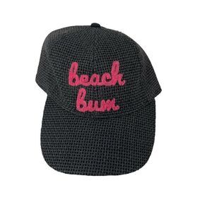 Beach Bum Hat Black Woven Baseball Cap Pink Embroidery Womens OS Strap Back NEW