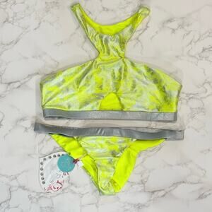 Beach Bunny 2015 Yellow Neon Galaxy Halter Top L & Skimpy Bottoms M $249