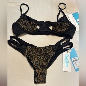 Brand NEW! Too small. Usually sold separately but I have it together as a set! Underwire bikini top with hook closure, Peek out holes beautiful lace detailing Cutout Skimpy bottom Cheeky fit