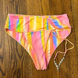 Vibrant bikini top with multicolor stripes. Features unique beaded straps. Brand new. Never worn. Tags were taken off.