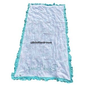 Best selling extra large terry cloth beach towel with a satin ruffle trim. A must-have for every bunny. Features Beach Bunny logo.