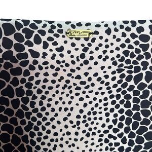The swimwear has a unique cheetah animal print, with red accents for contrast. The front of the top is structured with molded cups, offering support and shape. It is designed with a sweetheart neckline. The back of the top has a crisscross lace-up design, which adds a fashionable and adjustable element to the piece. The bottoms is basic boy cut. They feature the same black and white pattern with lace detailing on the sides. The straps on the top are adjustable, allowing for a customized fit. The bottoms feature a braided side design.