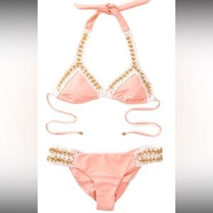This Beach Bunny bikini showcases a delicate blend of pink and white, featuring a triangle-style top with elegant crochet trim. The halter straps and matching bottoms maintain a cohesive and feminine aesthetic, perfect for a stylish swim.