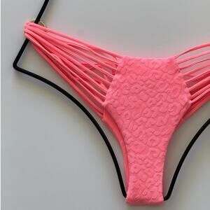 This Beach Bunny Indy Micro Tango Bottom comes in a bright neon pink shade with a textured tonal leopard pattern throughout the front and back panels. The fabric features a raised, velvety animal-print texture that gives the bikini a bold and playful look. The sides have multiple thin neon-pink spaghetti straps, creating a sexy, strappy silhouette that sits beautifully on the hips or worn high-leg. The vibrant pink color is eye-catching, summery, and perfect for tanning.